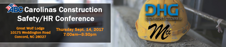 The Associated Builders and Contractors (ABC) of the Carolinas annual Construction Safety and HR Conference will be held September 14, 2017 at the Great Wolf Lodge in Concord, NC.